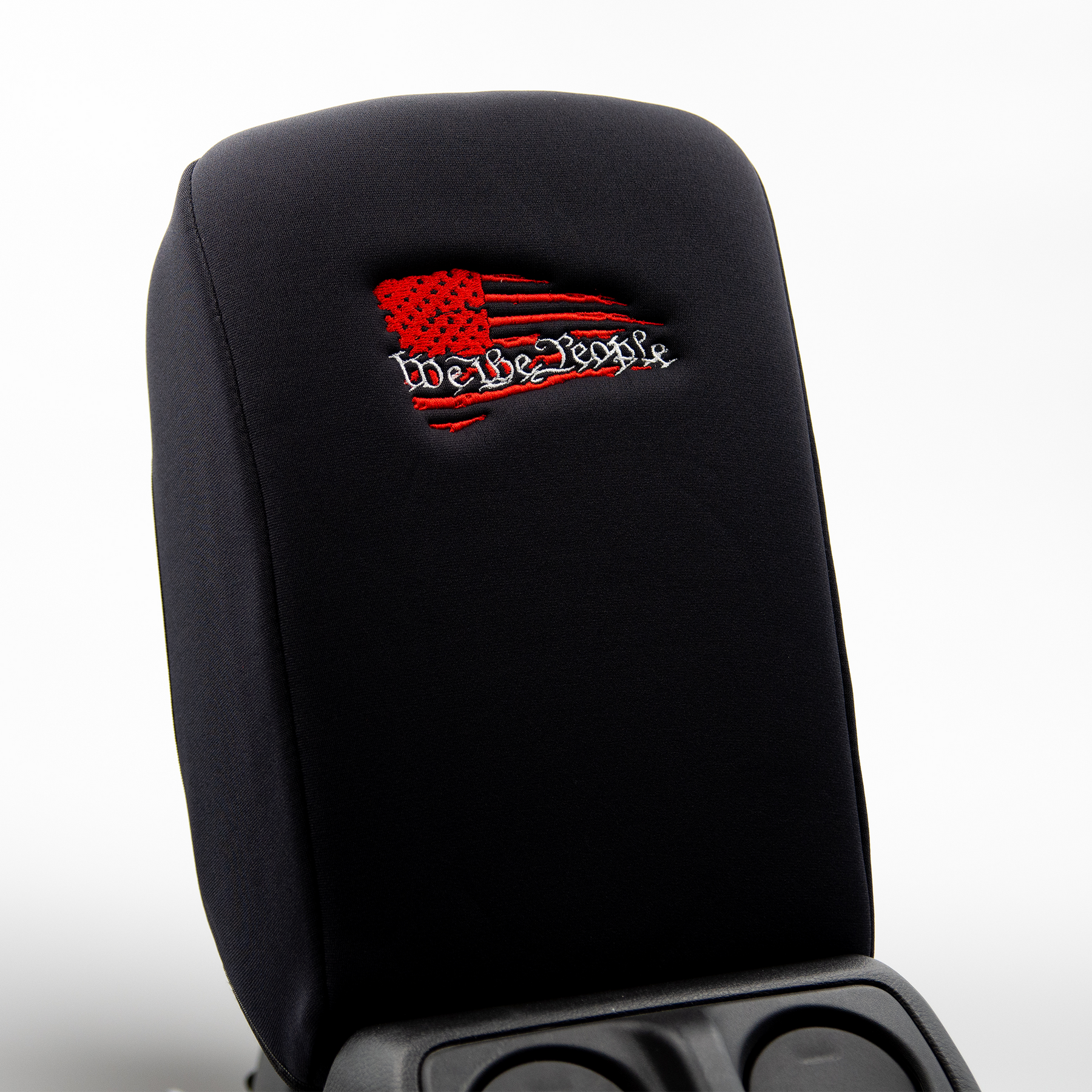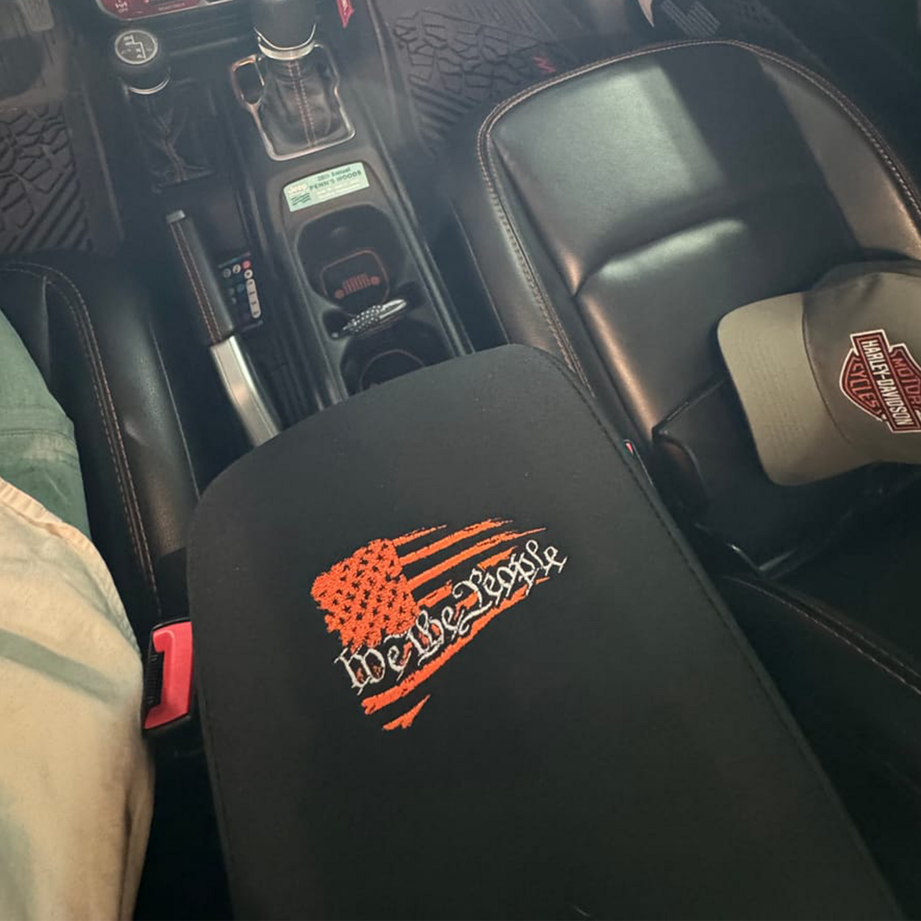 Show your patriotism with our custom "We The People" embroidered armrest console cover, featuring a flying American flag and bold text in your choice of thread color.